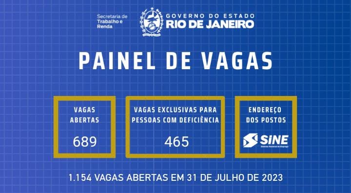 A Secretaria de Estado de Trabalho e Renda (Setrab) oferta 1.154 vagas, sendo 465 vagas de emprego para portadores de necessidades especias ( PCD) para a população fluminense. As oportunidades foram captadas pelo Sine (Sistema Nacional de Emprego) . São vagas para diferentes funções. . Para se inscrever ou atualizar o cadastro, no caso do Sine, é necessário ir a uma unidade do Sistema Nacional de Emprego levando os documentos de identificação civil, carteira de trabalho, PIS/Pasep/NIT/NIS e CPF.