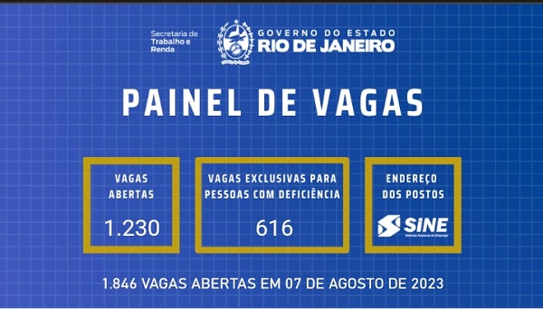 A Secretaria de Estado de Trabalho e Renda (Setrab) oferta 1.846 vagas, sendo 616 vagas de emprego para portadores de necessidades especias ( PCD) para a população fluminense. As oportunidades foram captadas pelo Sine (Sistema Nacional de Emprego) . São vagas para diferentes funções. . Para se inscrever ou atualizar o cadastro, no caso do Sine, é necessário ir a uma unidade do Sistema Nacional de Emprego levando os documentos de identificação civil, carteira de trabalho, PIS/Pasep/NIT/NIS e CPF.